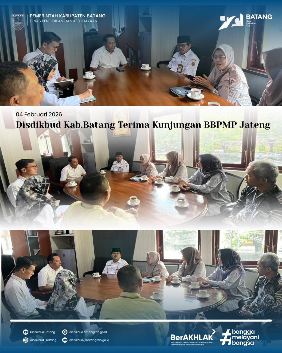 Batang Dinas Pendidikan dan Kebudayaan (Disdikbud) Kabupaten Batang menerima kunjungan dari Balai Besar Penjaminan Mutu Pendidikan (BBPMP) Provinsi Jawa Tengah dalam rangka memperkuat sinergi peningkatan mutu pendidikan di daerah.